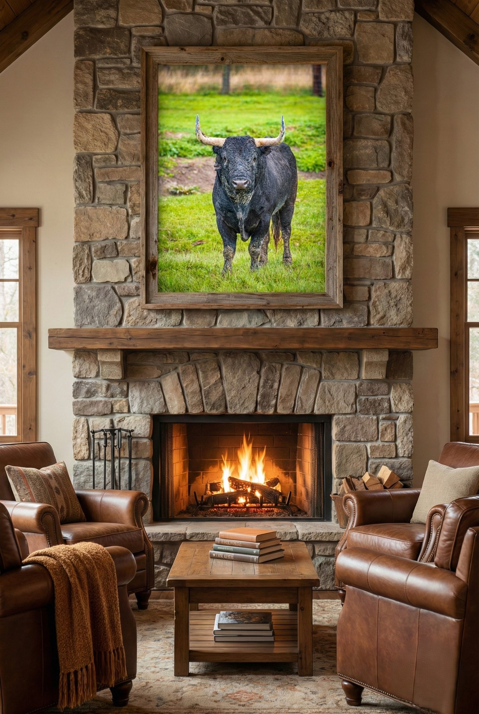 La belleza rústica de la supervivencia. Esta fotografía es un retrato frontal sin artificios: un toro bravo marcado por el barro de la dehesa. La tierra seca en su rostro y patas cuenta la historia de la vida en libertad, del invierno y de la dureza del campo.