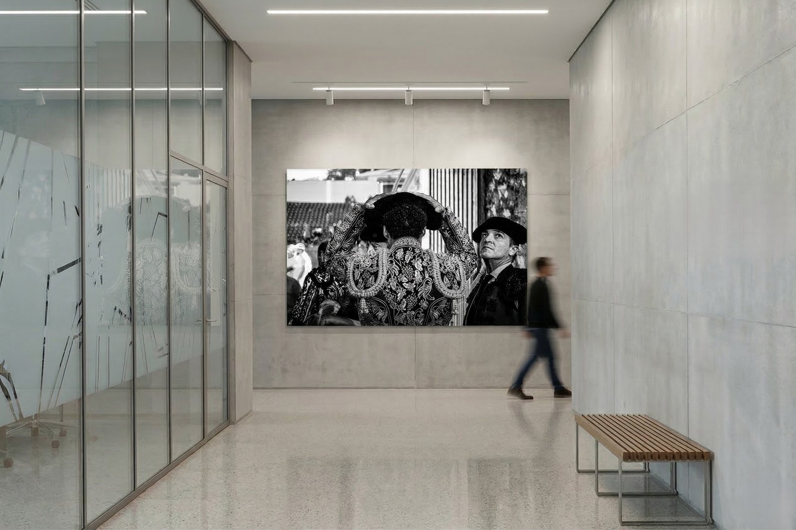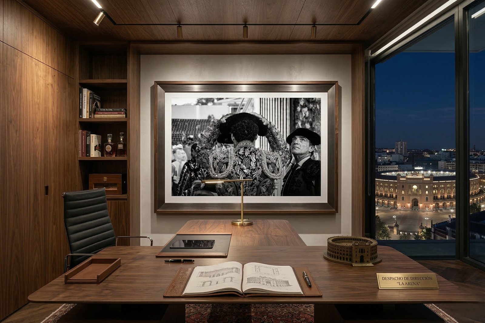 Captura en riguroso blanco y negro que refleja la gravedad de los instantes previos al paseíllo. La imagen destaca la profundidad de las texturas y los bordados del traje de luces en la espalda del matador mientras se ajusta la montera. Todo ello bajo la observación atenta del subalterno, transmitiendo la tensión contenida y el silencio que preceden a la lidia.